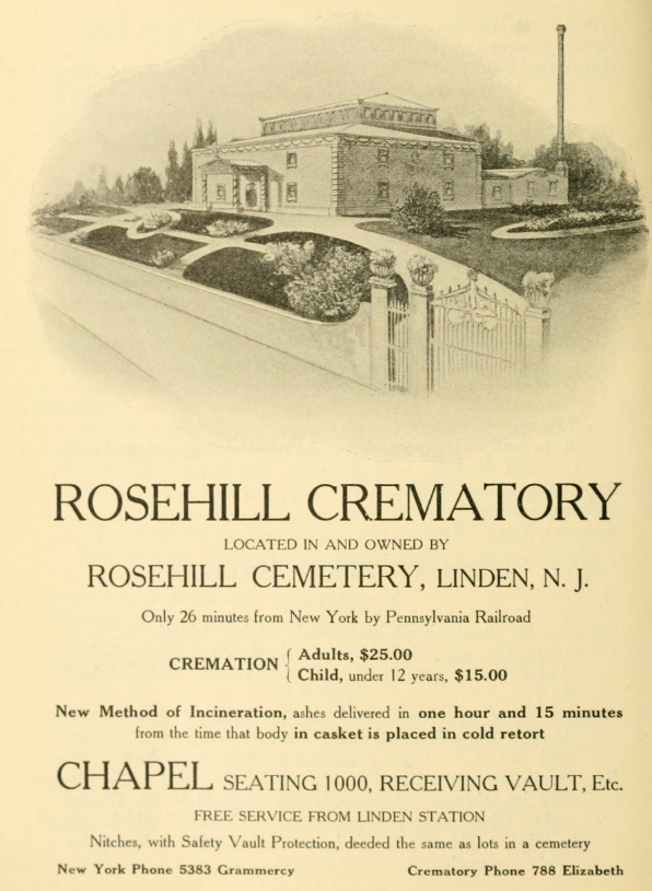 Rosehill Crematory and Cemetery, Linden, NJ. Non-sectarian. Owned by Rose Hill Cemetery Association, also owners of Rosehill Crematory located in the cemetery.